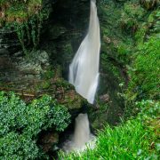 Through the centuries, the river Trevillet has carved its way through Late Devonian slate, creating a magnificent 60-foot waterfall which has punched a hole through the original kieve (basin). The water now cascades from this through the beautiful flora-laden valley.